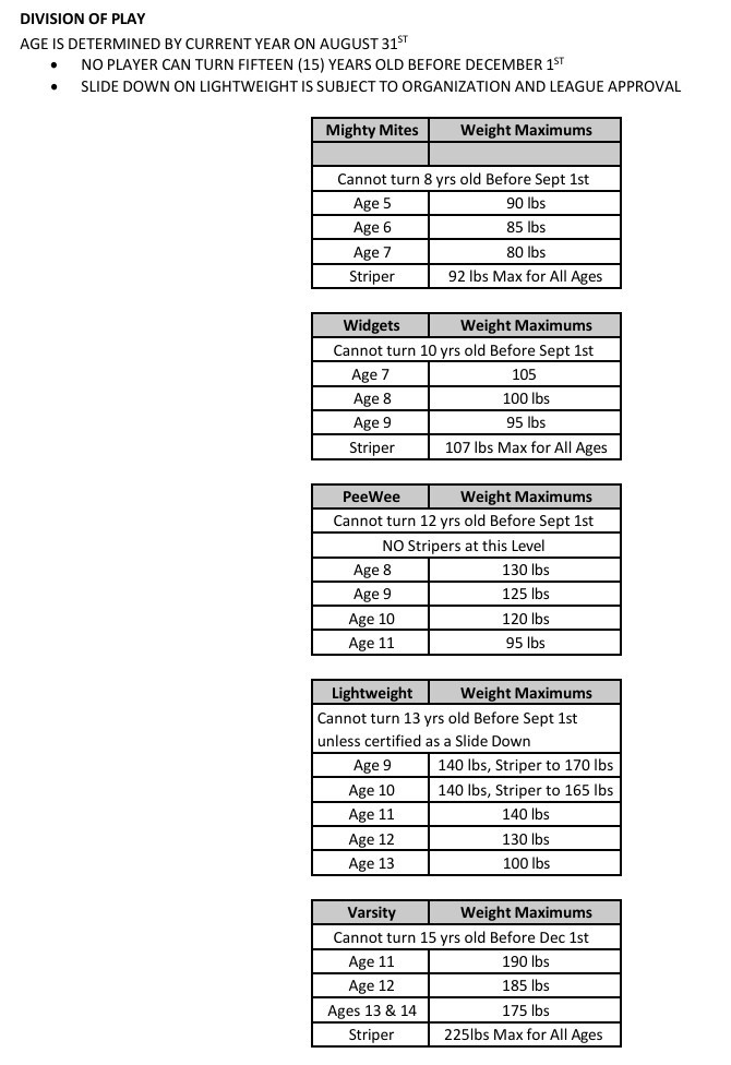 Our organization is age and weight based for the safety of all our players. Please see the age weight matrix at the bottom of the page for more information.